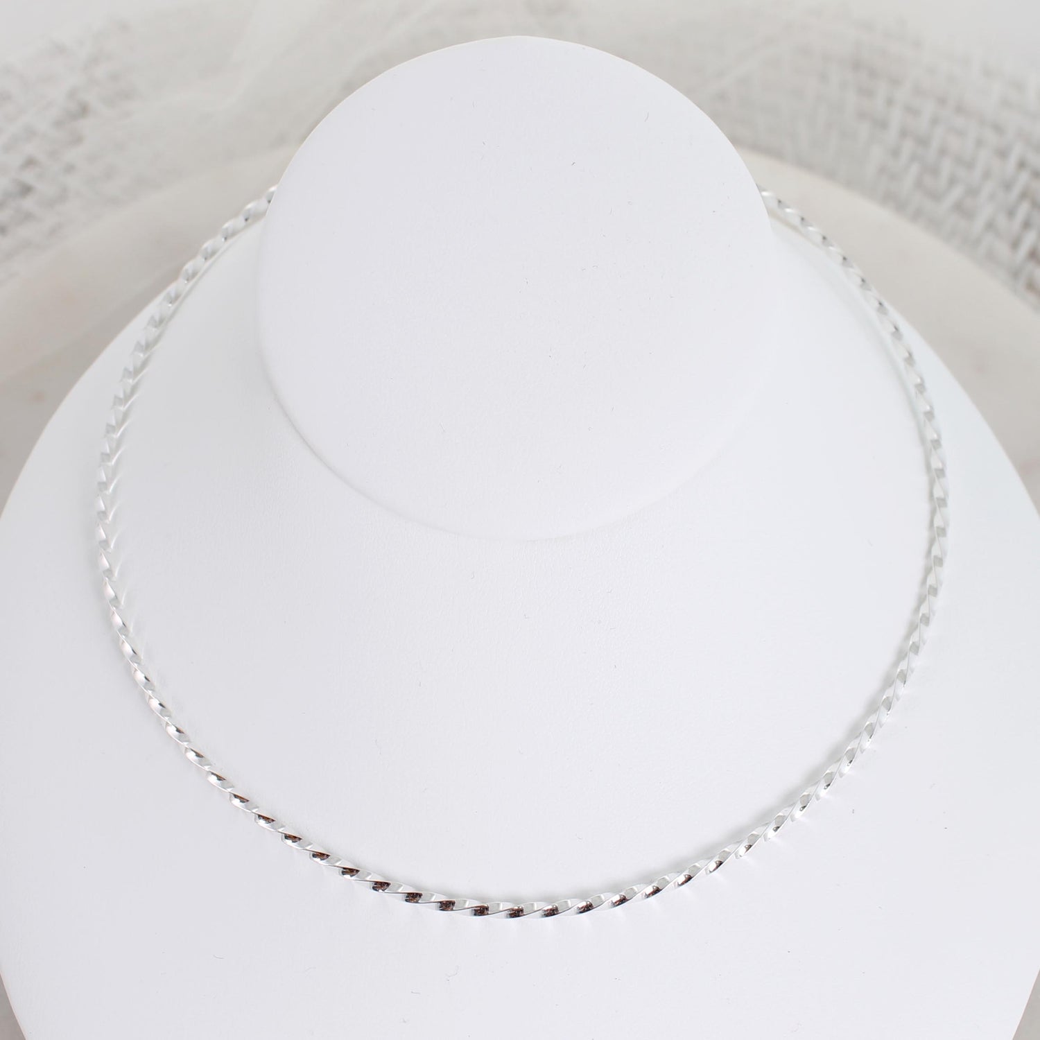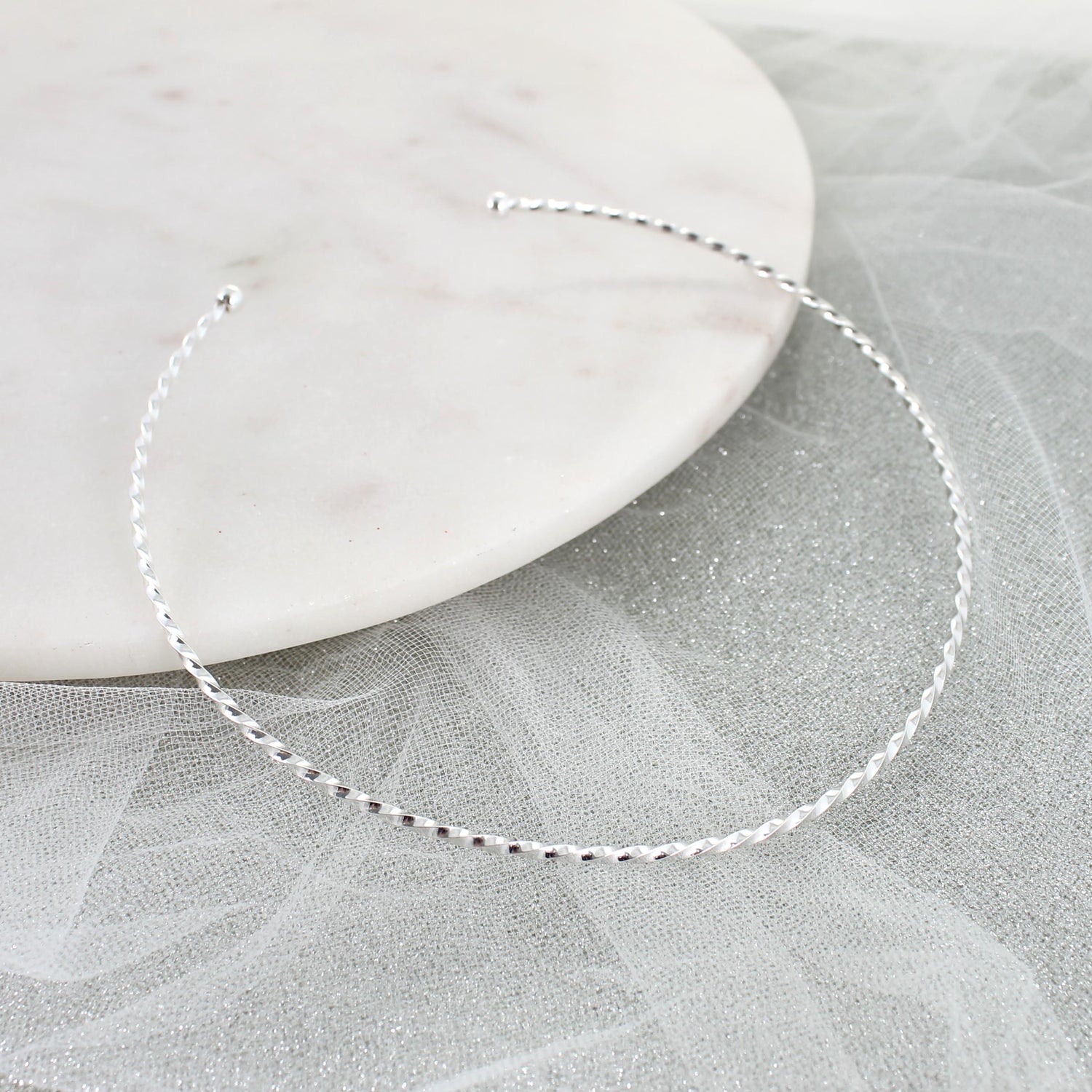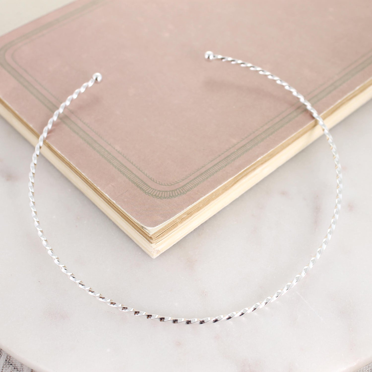Silver tone neck wire with a twisted cable style. 5 inches in diameter.