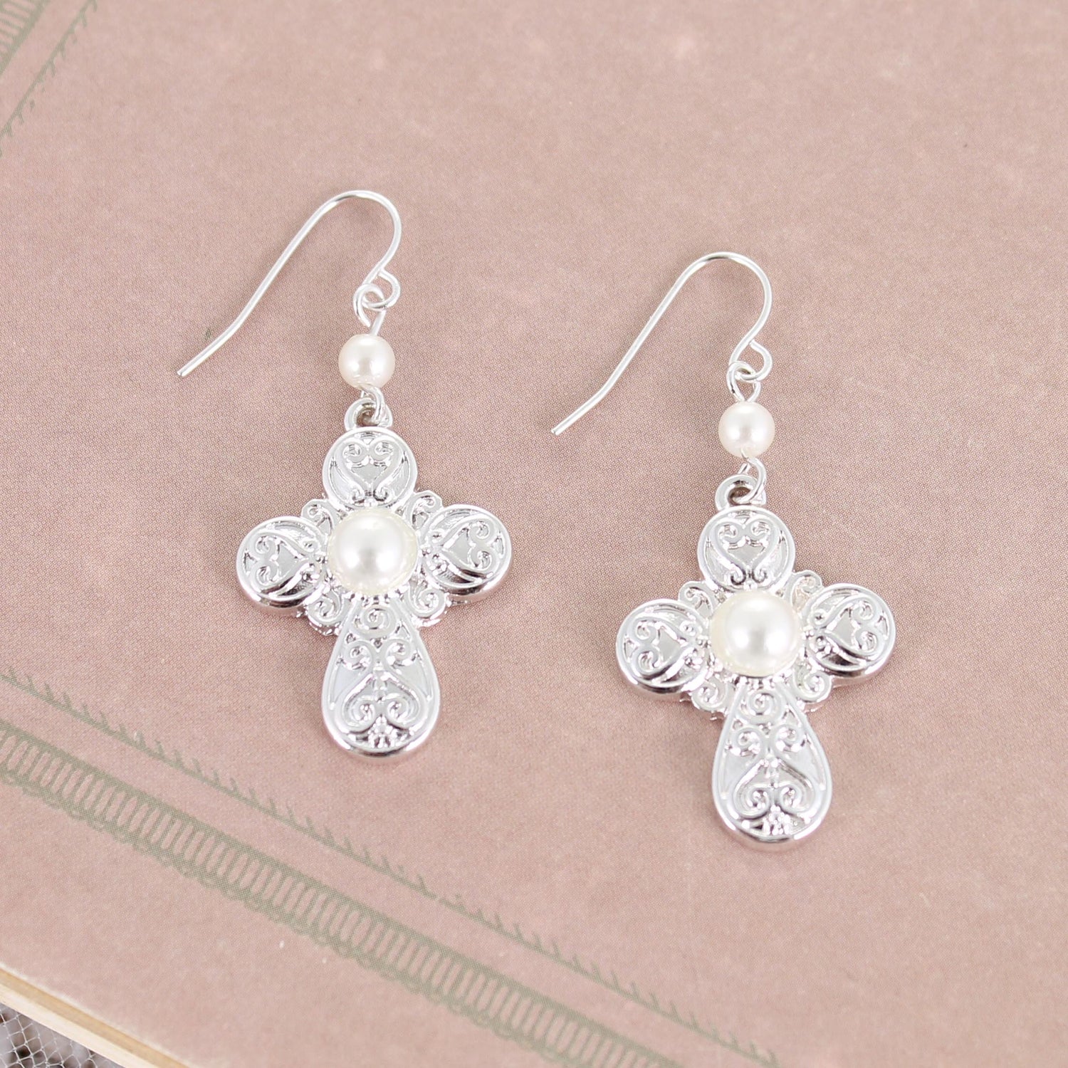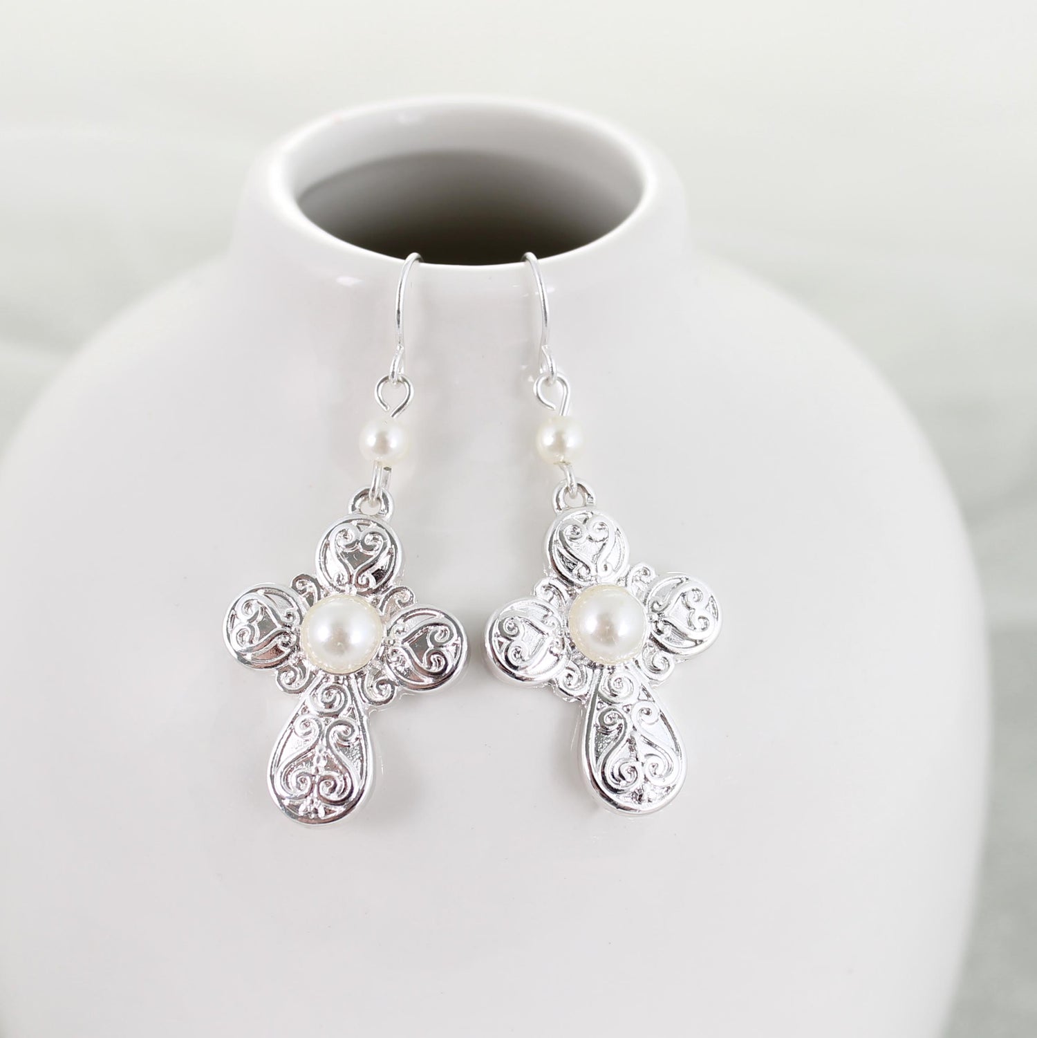 Silver tone shepherd hook earrings featuring a filigree cross with imitation pearl accents. Cross measures an inch in height.