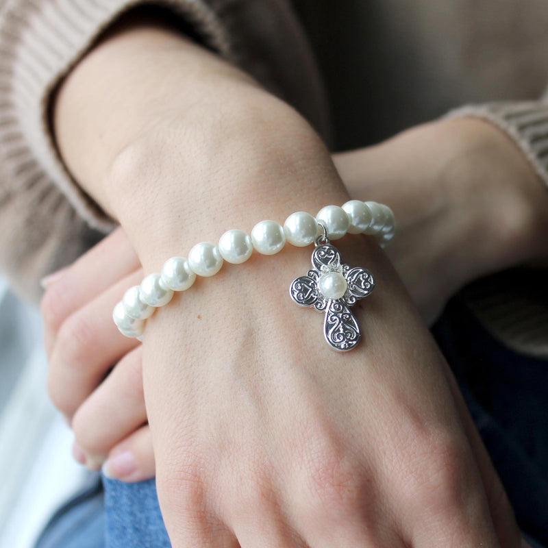 Silver Filigree & Pearl Cross Stretch Bracelet