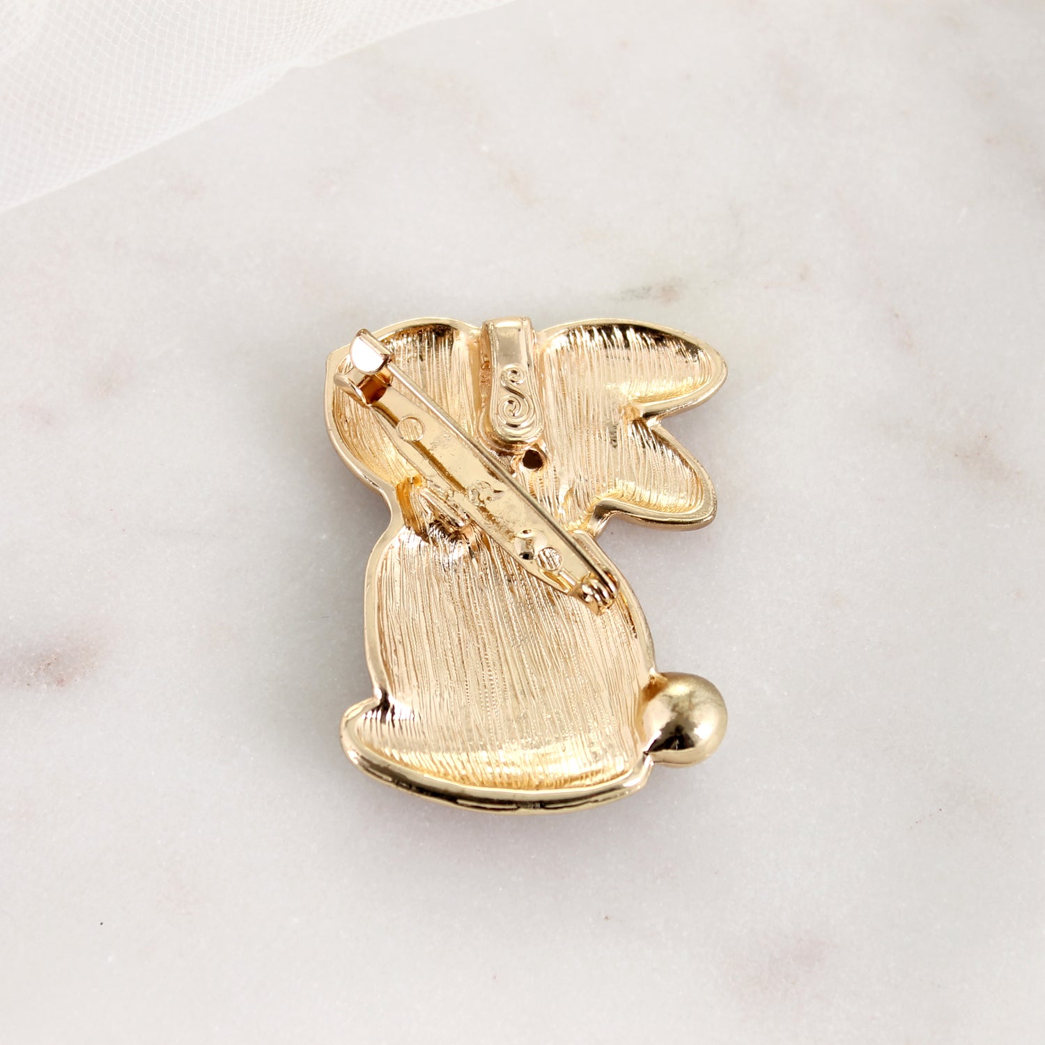 Gold tone magnetic clasp pin/pendant featuring an enamel rabbit design with pearl accents. This sweet Easter bunny measures about two inches in height.