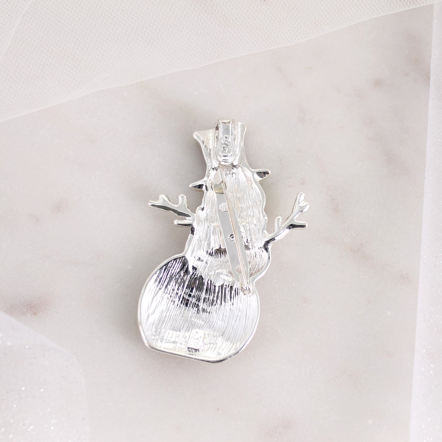 Silver tone magnetic clasp pin/pendant featuring a frosted enamel snowman with glitter enamel accents. Perfect for Winter and Christmas! Snowman measures just under 3” in height.