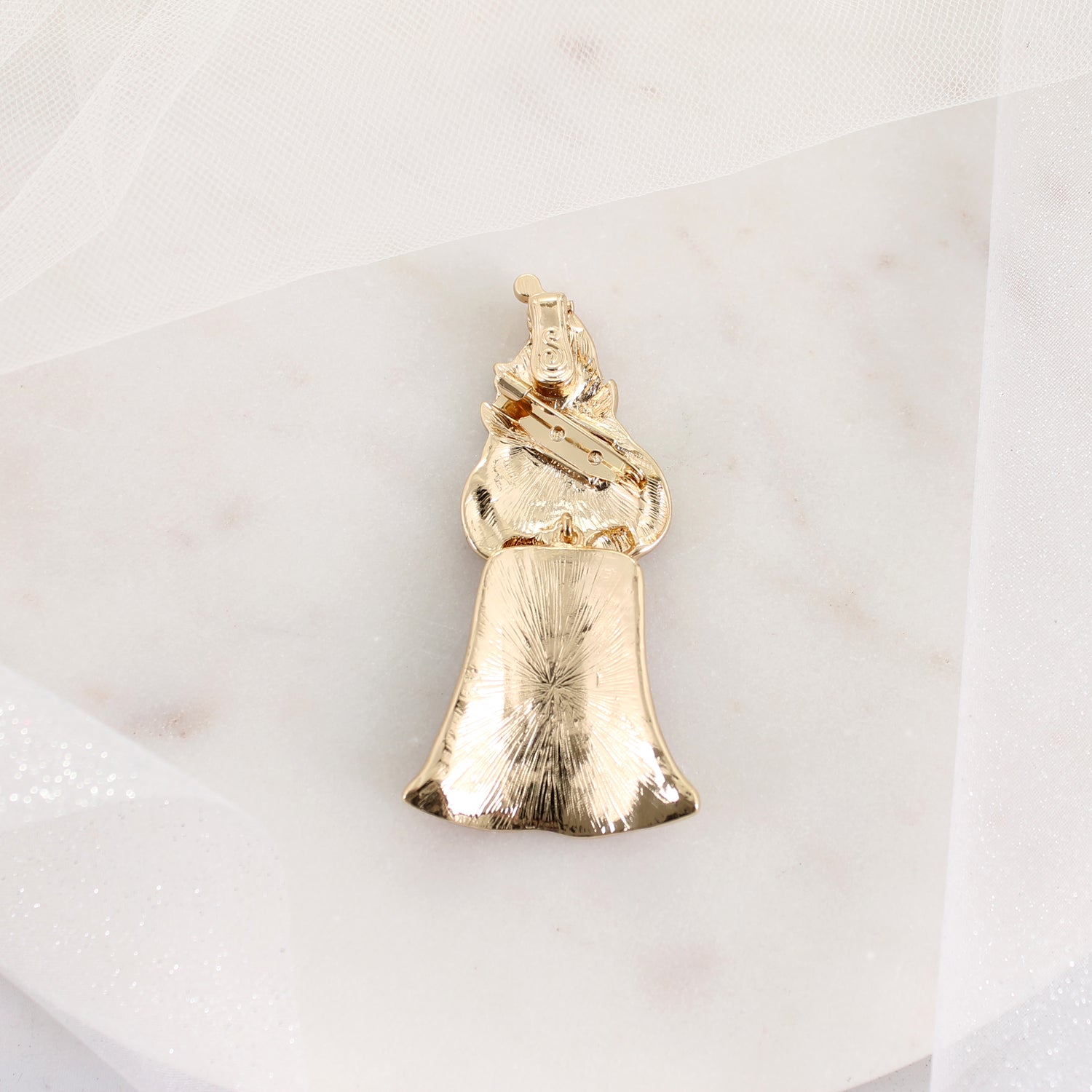 Gold tone magnetic clasp pin/pendant featuring an enamel Saint Nick design. Bottom half dangles and features crystal accents. Perfect for Christmas! Pin/pendant measures just over 3” in height.