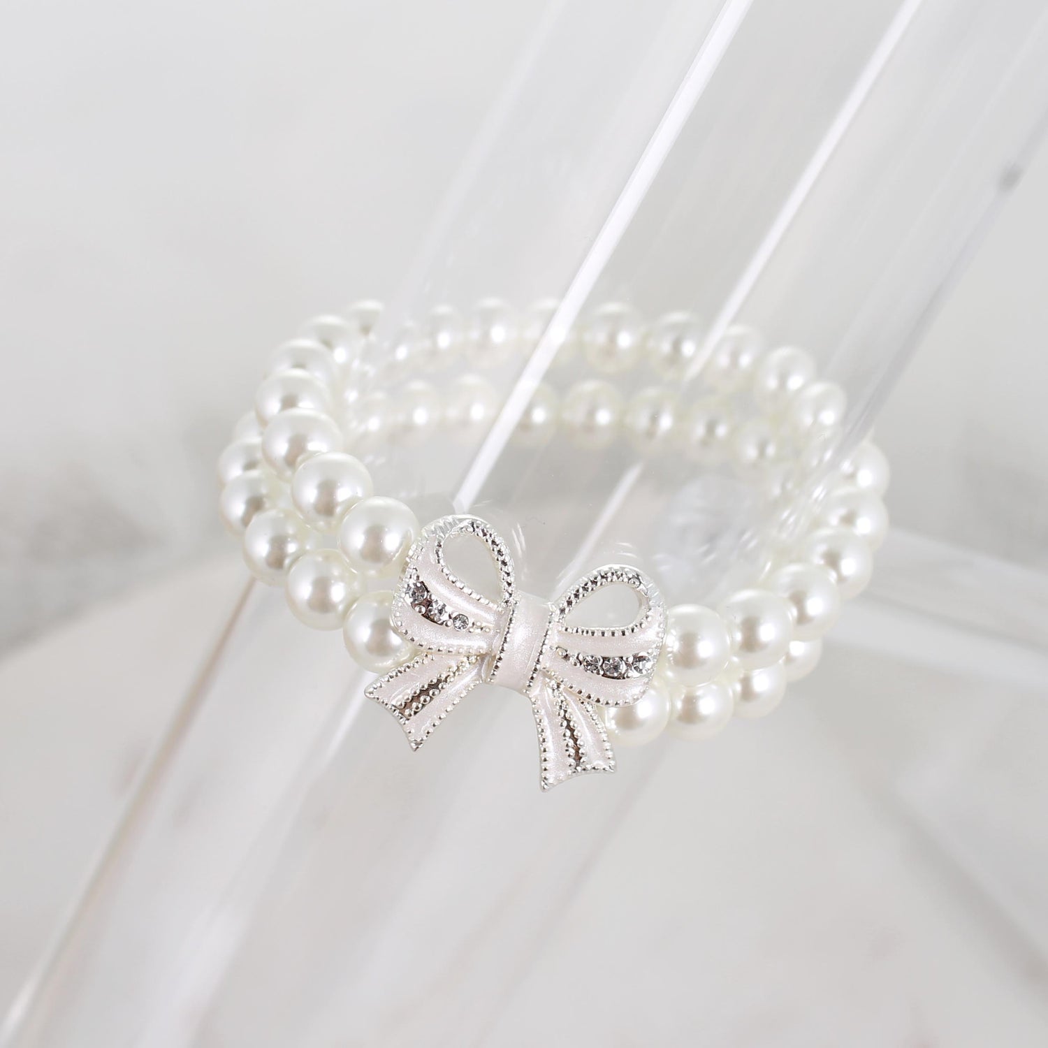 Double stretch bead strand of imitation pearls connected by a silver tone and enamel bow charm with clear crystal accents. Charm measures ~1 inch in height.