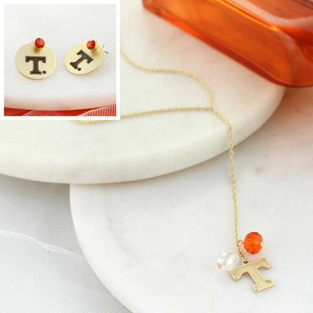 - 24" Y-necklace features a 4" drop with coordinating collegiate beads and a matte gold collegiate charm. Claw clasp and 2" extender adds even more versatility to this piece.