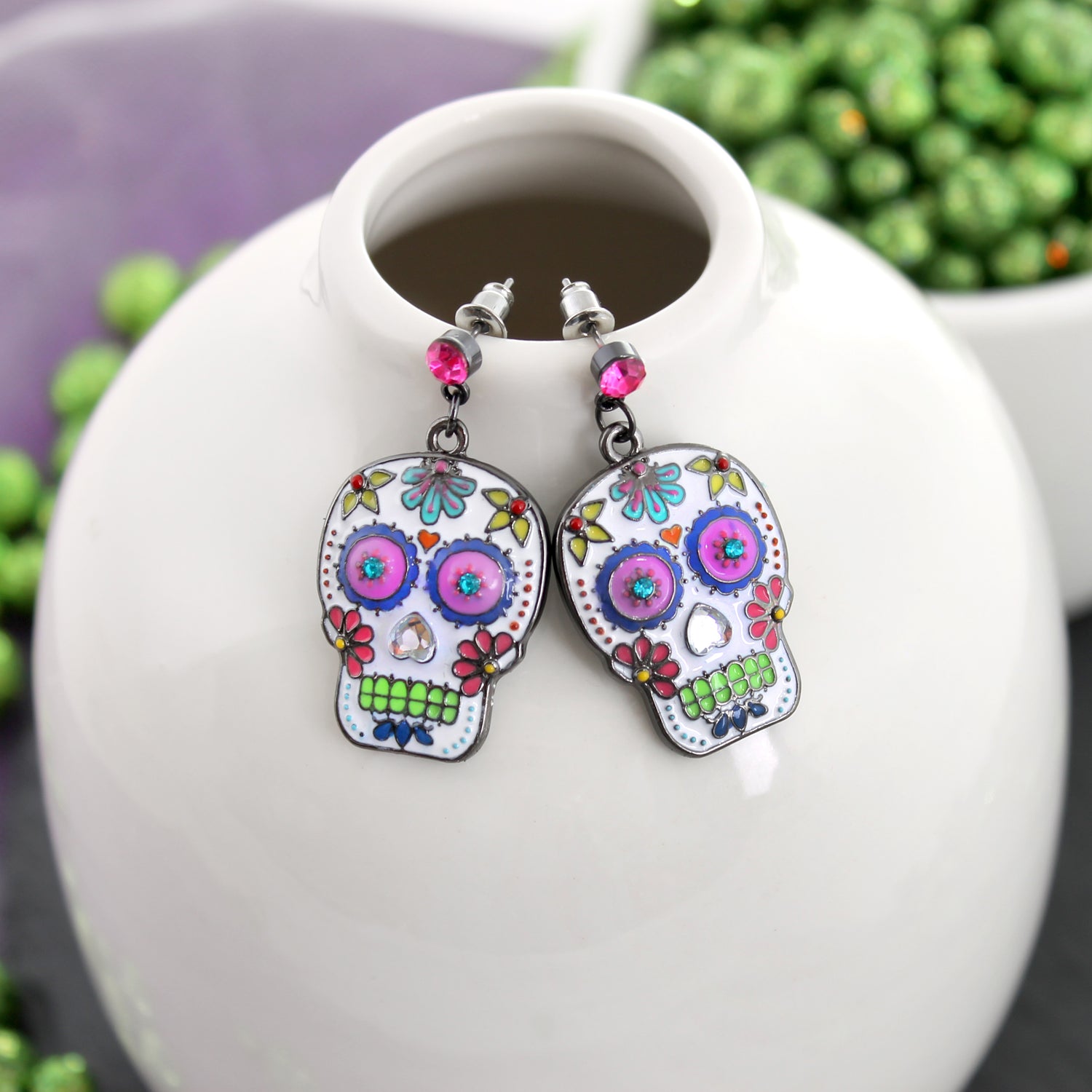 Gunmetal tone post hook earrings featuring enamel and rhinestone sugar skulls. These Day of the Dead Calavera charms measure about one inch in height.